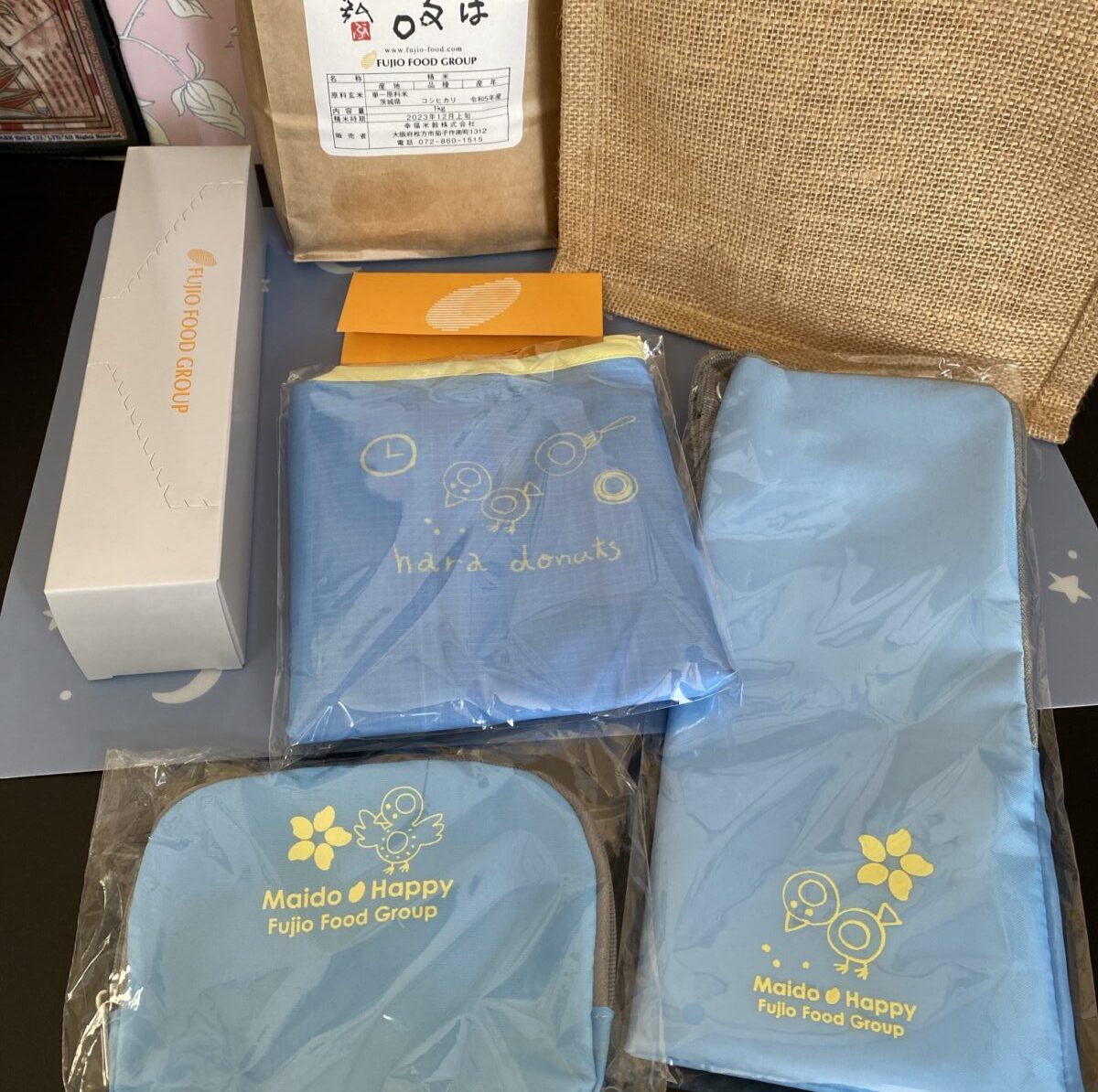 フジオフード福袋2024年新春版はジップバックやコメ、エコバッグなどがはいってました。