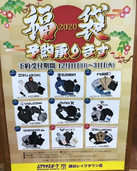 レイクタウンkazeではファッション系のブランド中心に福袋の販売予告がちらほら店頭告知されていました。