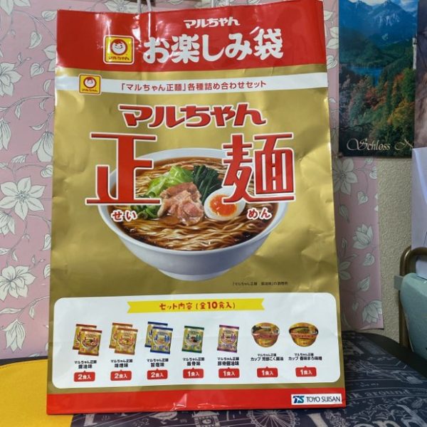 いろんなもの値段が上がった影響でマルちゃん正麺の福袋に入る袋麺の数が減りました。