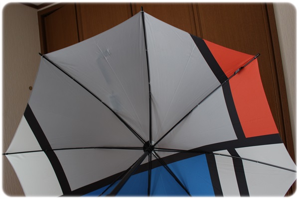 MoMAz(ニューヨーク近代美術館)コレクションに収蔵されている、Piet Mondrian(ピエト・モンドリアン)による1921年の作品 「Composition in Red, Blue, Black, Yellow and Gray(赤、青、黒、黄、灰のコンポジション)」にインスパイアされた模様をスクリーンプリントした長傘。