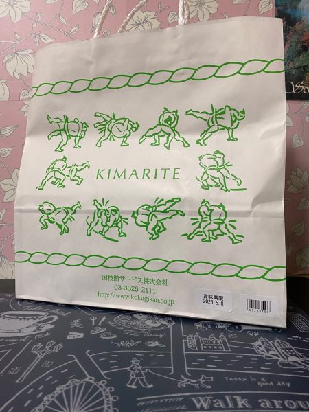 KIMARITEと書いてある紙袋には力士たちが描かれています